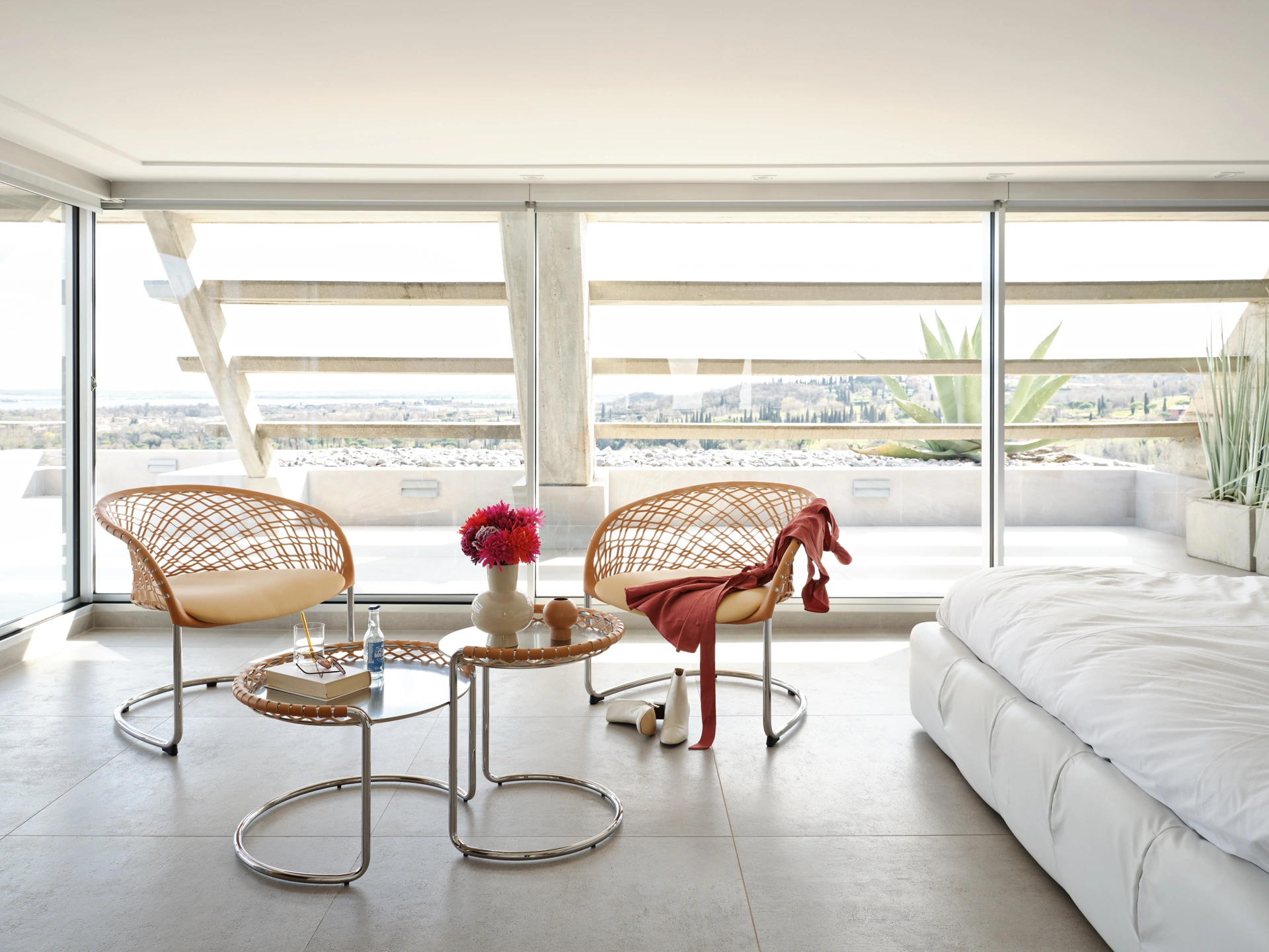 La serie P47 di Midj, ideata da Franco Poli nel 2021, si distingue per un'estetica avanguardistica e una magistrale integrazione del cuoio. L'elemento distintivo risiede nell'ancoraggio diretto del cuoio alla robusta struttura metallica mediante rivetti a vista, una soluzione che non solo enfatizza il design ma genera una tensione ergonomica per un comfort superiore. Questa collezione versatile offre diverse tipologie di sedute, tra cui poltrone, sedie lounge, sedie da ufficio, sgabelli, divani e pouf, arricchita da eleganti tavolini. La selezione dei materiali include cuoio toscano o TK, metallo e pregiati rivestimenti in pelle, ecopelle o tessuto, garantendo durabilità e finiture di alta qualità. La scrupolosa selezione dei materiali e l'ingegneria del design garantiscono una durabilità e una qualità costruttiva superiori, rendendo ogni elemento della collezione P47 un investimento nel tempo.