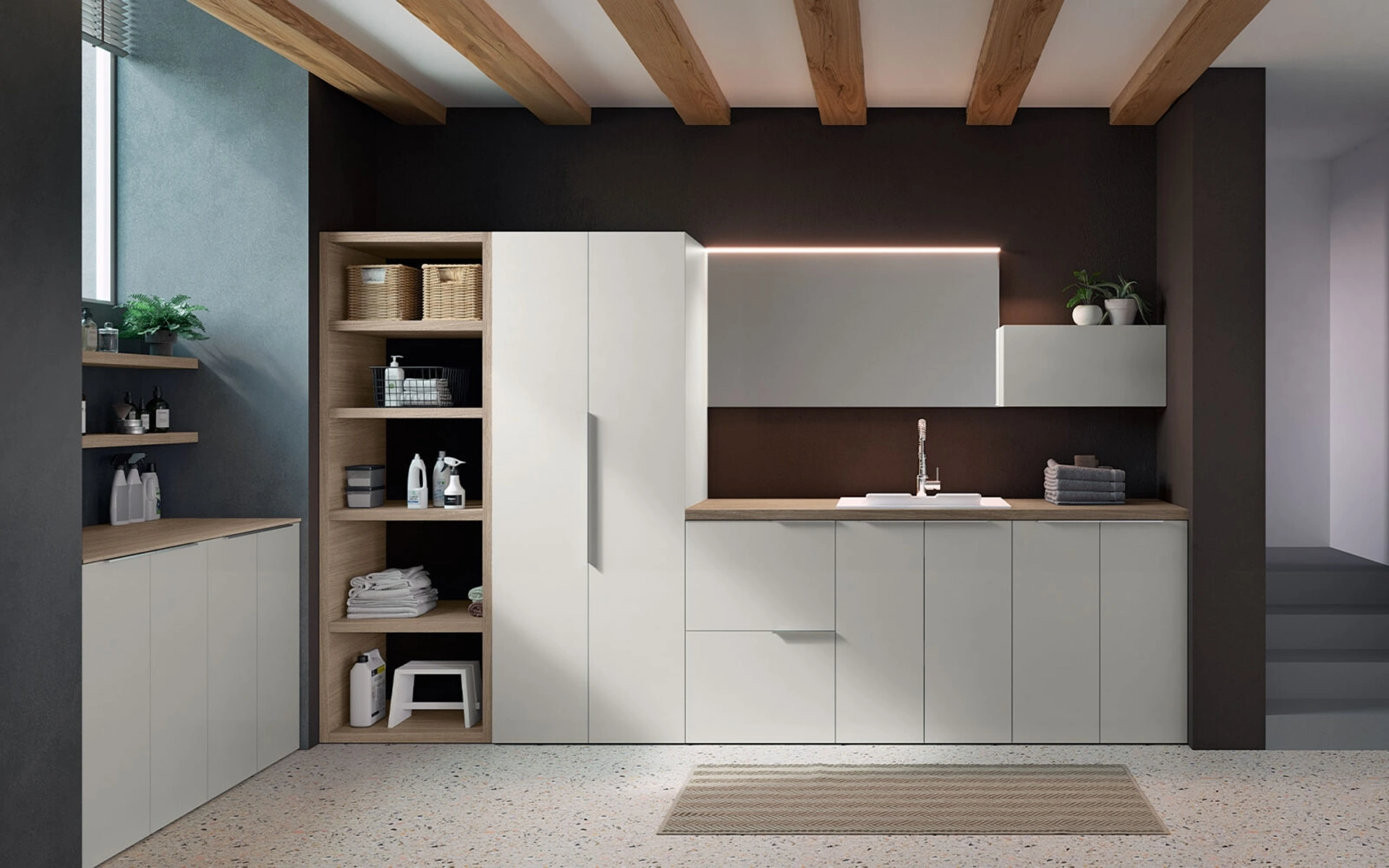 Il Mobile Lavanderia Airy My Space 03 di RCR rappresenta una soluzione avanzata per l'ottimizzazione degli ambienti bagno. Questo elemento d'arredo, parte della collezione Airy My Space, è concepito per integrare funzionalità e design contemporaneo. La sua struttura versatile permette l'incorporazione di un lavabo e moduli contenitivi, ideali per una gestione efficiente dello spazio. Il programma Airy introduce nuove opzioni di modularità e finiture, consentendo una personalizzazione approfondita dell'ambiente. La composizione standard prevede l'utilizzo di basi in nobilitato con finitura legno bruciato, un lavabo in ceramica con superficie bianco opaco, una specchiera dal design quadrato e un pratico porta salviette in nero opaco. Questo sistema è progettato per garantire durabilità e prestazioni ottimali, offrendo una combinazione equilibrata di estetica e funzionalità intrinseca.