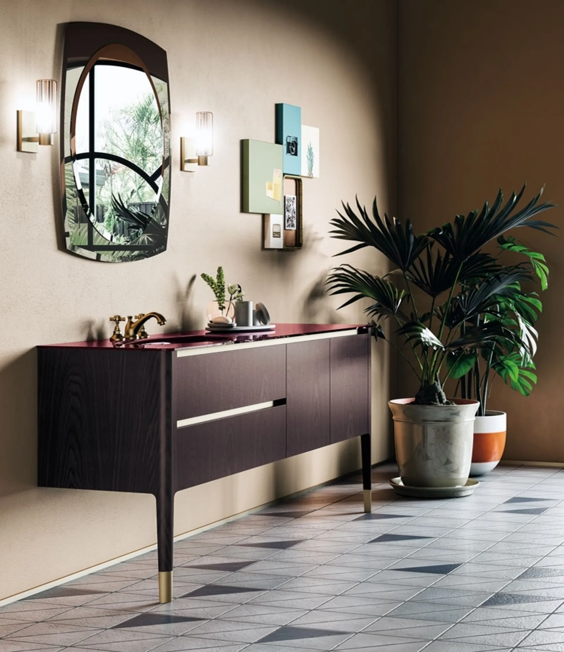 Il mobile bagno ART06, espressione del design classico contemporaneo di Puntotre, è disponibile per essere ammirato presso il nostro showroom F.lli Ronchetti Snc a Cantù. Questa composizione si distingue per il suo sviluppo orizzontale e l'elegante piano consolle in vetro, che si integra perfettamente con i cassettoni dotati di pratica apertura a gola. L'accostamento raffinato del Mogano con il Vetro laccato lucido color vino, che include una vasca integrata, conferisce un'estetica di grande impatto. Completa il tutto uno specchio con illuminazione integrata, che aggiunge un tocco di modernità e funzionalità. Invitiamo i clienti di Cantù e delle aree circostanti a scoprire la qualità e l'eleganza di ART06, una delle soluzioni più apprezzate nel nostro punto vendita, con la garanzia di un servizio completo.