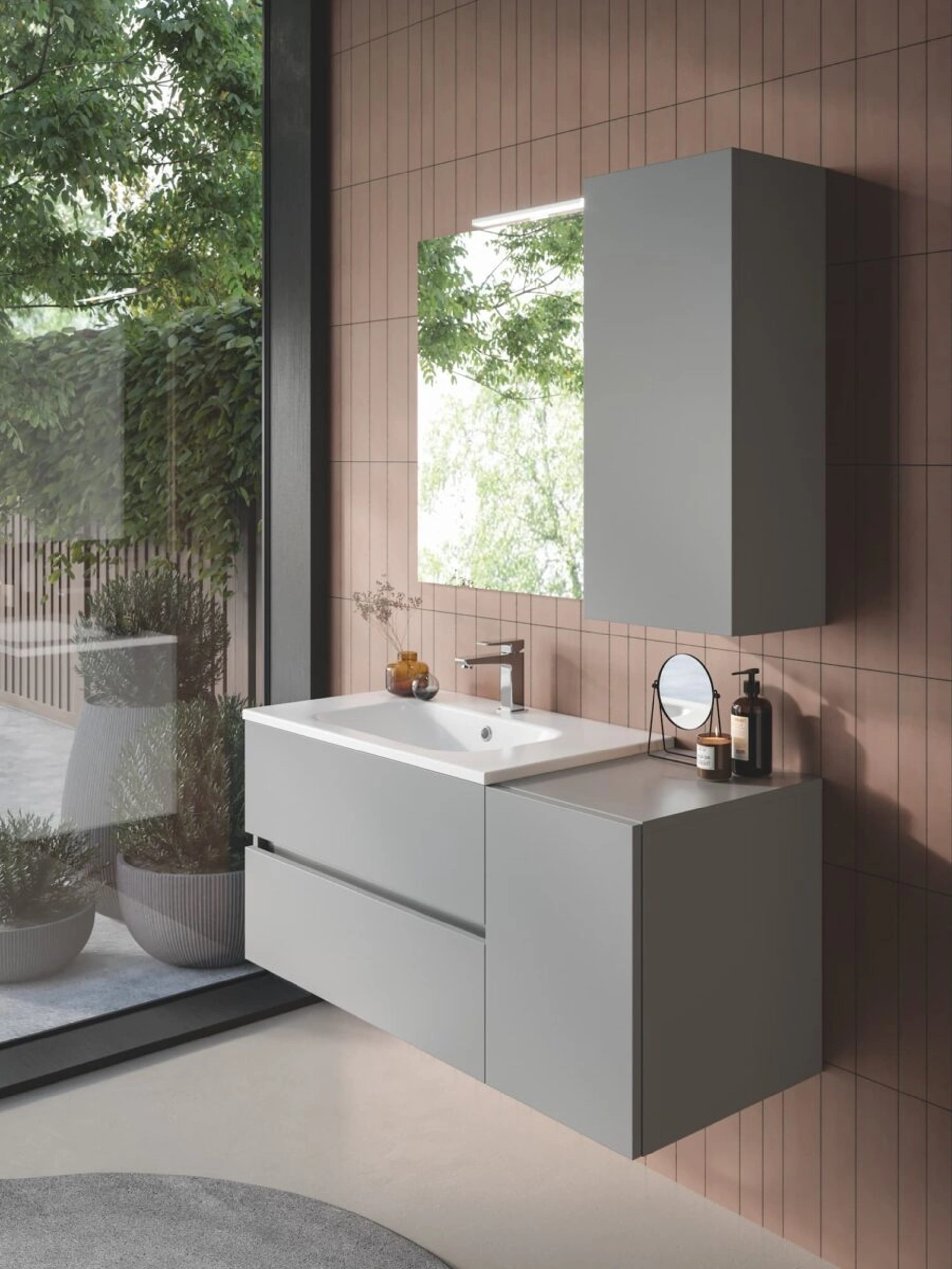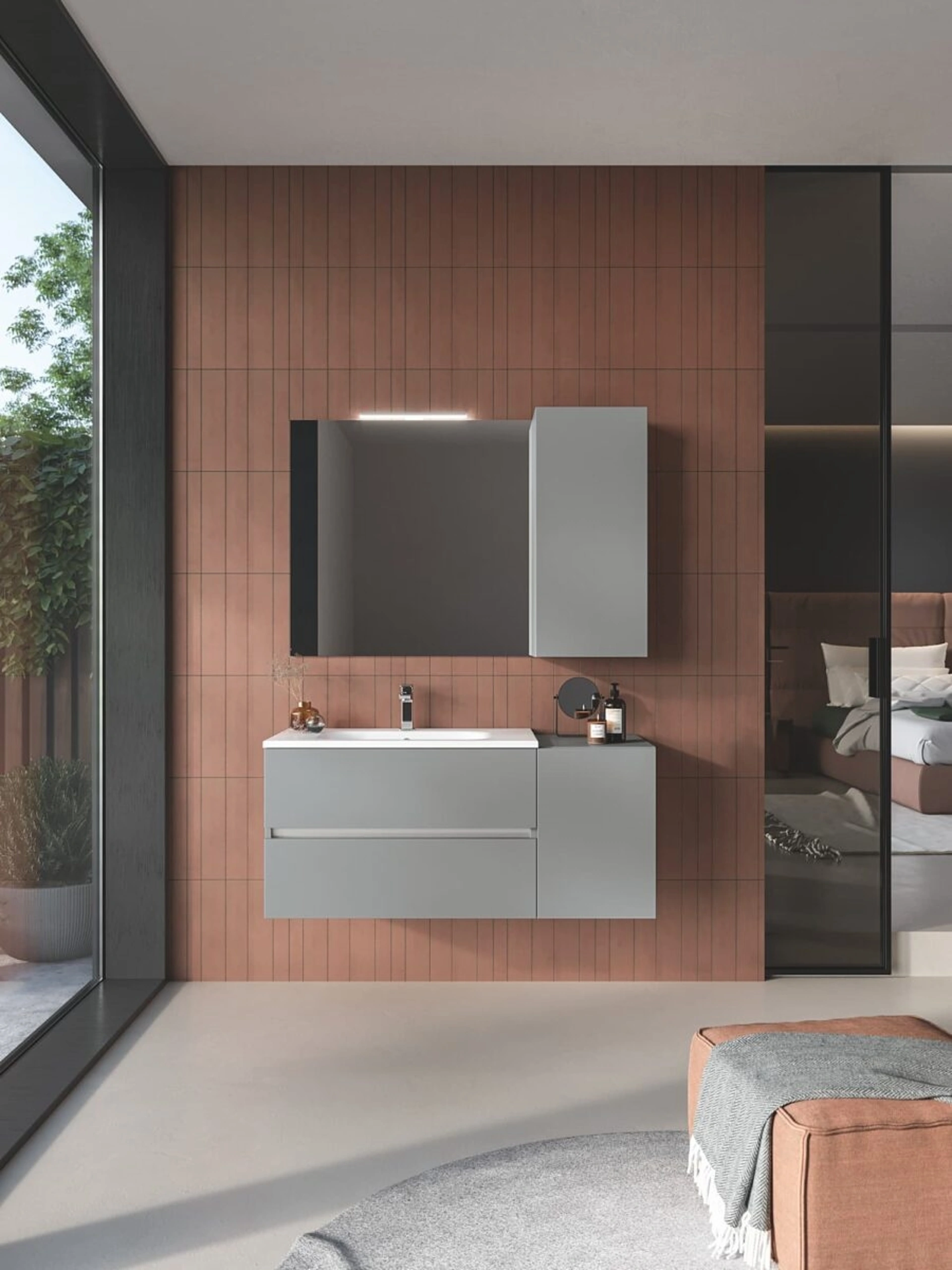 La collezione Fast di RCR Arredo Bagno è concepita per offrire un'ottimizzazione avanzata degli spazi, introducendo soluzioni d'arredo bagno estremamente pratiche e altamente funzionali, adatte anche ad ambienti di dimensioni contenute. Il design si distingue per la sua purezza volumetrica e la razionalità delle linee, che si traducono in mobili compatti ma con notevole capacità di stoccaggio, pensati per un'esperienza d'uso agevole e intuitiva. La specifica configurazione Fast 02 integra un monoblocco dotato di due cassetti e una consolle in pregiato Mineralmarmo, affiancato da una base con un'anta singola, una specchiera modello Vela arricchita da un faretto Hera per un'illuminazione ottimale, e un pensile a un'anta che completa la modularità della composizione, garantendo funzionalità e coerenza estetica. Per approfondire le caratteristiche tecniche, le finiture disponibili e le opzioni di configurazione, è consigliabile consultare la documentazione dettagliata del prodotto.