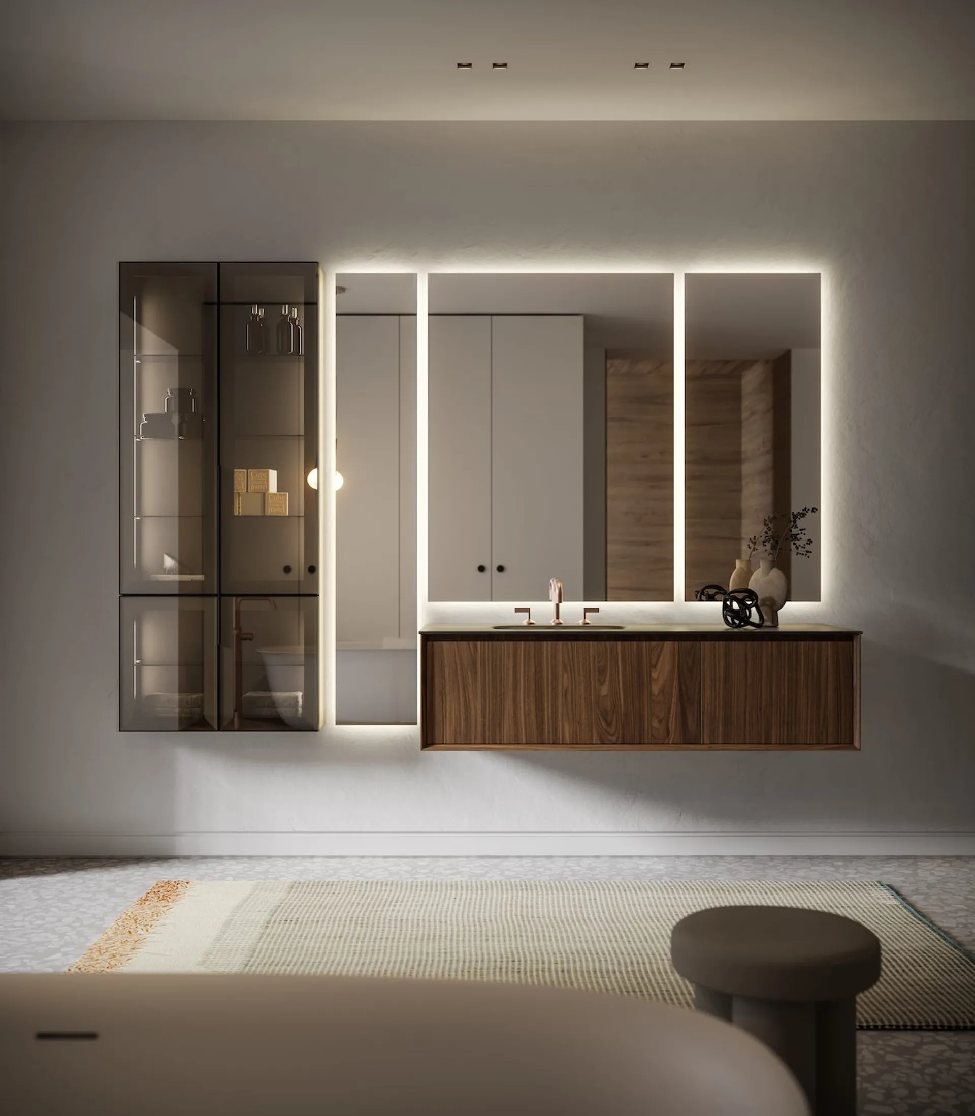 Vieni a scoprire l'esclusiva composizione Modula Comp.07 di Puntotre Arredobagno, un vero capolavoro di design e funzionalità, ora disponibile per la visione e l'acquisto presso il nostro showroom F.lli Ronchetti Snc a Cantù. Questa raffinata soluzione d'arredo bagno mette in risalto la nobiltà del Noce Canaletto e la delicatezza del vetro satinato. I dettagli esclusivi e i suggestivi giochi di luce, abilmente creati dagli specchi illuminati, conferiscono un'atmosfera unica e accogliente. La praticità è assicurata da un'ampia colonna contenitiva e da colonne e pensili con frontali in vetro Stop-Sol, che possono essere dotati di illuminazione interna opzionale per accentuare ulteriormente il loro valore estetico e funzionale. La clientela di Cantù e delle aree limitrofe ha dimostrato grande apprezzamento per questo modello, che si conferma tra le soluzioni più ricercate per chi desidera un arredo bagno di design e qualità.