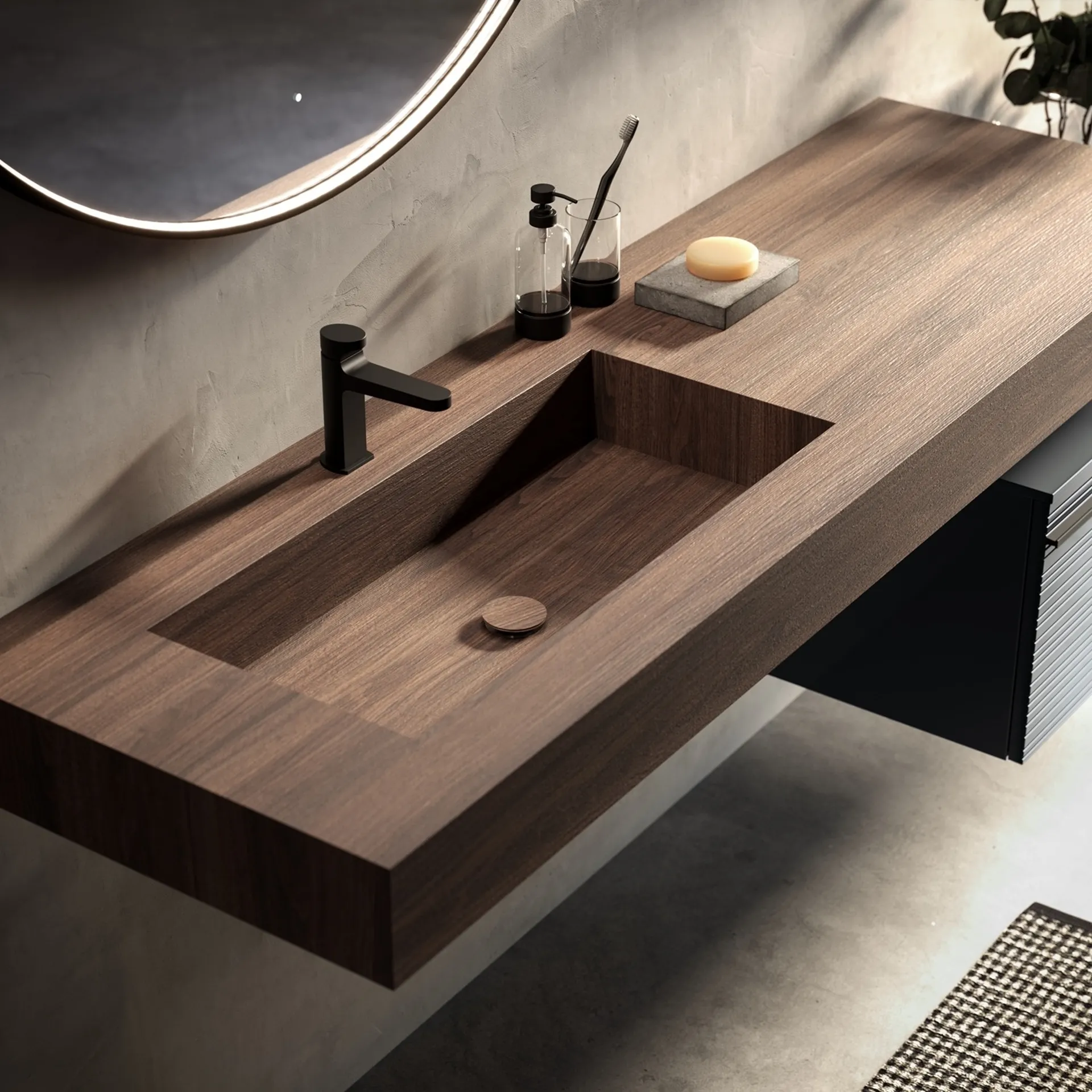 Il design della collezione Reverso di Puntotre si caratterizza per l'innovativa interpretazione dei frontali, arricchiti da finiture incise che generano un'estetica distintiva attraverso linee orizzontali discontinue. Il modello Re.12, esponente di questa linea, è dotato di un robusto top scatolato in HPL, configurabile in molteplici dimensioni fino a 240 cm e predisposto per diverse soluzioni di lavabo integrato. La sua versatilità si estende all'abbinamento con elementi complementari come lo specchio circolare SATURN, che introduce un dinamico contrasto con la geometria rigorosa e squadrata degli altri moduli. Per un approfondimento sulle specifiche tecniche dei materiali e le opzioni di finitura disponibili, vi invitiamo a consultare la documentazione tecnica del prodotto.