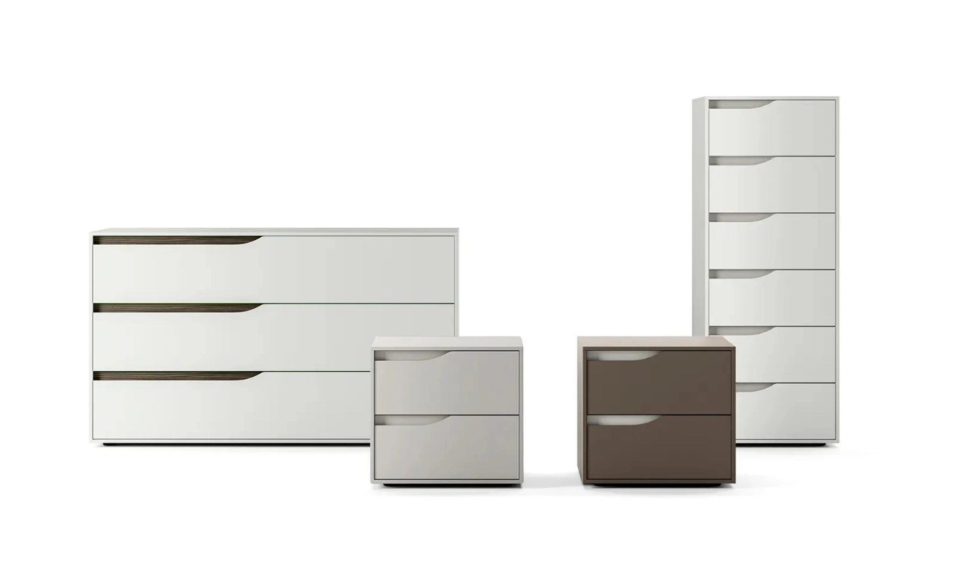 Il gruppo notte Wind di Dielle Modus si distingue per un design contemporaneo e funzionale, dove l'elemento caratterizzante è l'inserto maniglia orizzontale. Questa soluzione integrata nello spessore dell'anta genera raffinate fasce grafiche sui frontali, offrendo ampie possibilità di personalizzazione cromatica. La serie di contenitori per la zona notte, che comprende comodini, settimanali e comò, è progettata per garantire massima flessibilità compositiva e disponibilità in diverse misure, facilitando l'organizzazione e l'integrazione armonica in ogni ambiente. Una proposta che coniuga estetica essenziale e funzionalità avanzata per un arredamento distintivo. Questa collezione rappresenta una soluzione funzionale che unisce estetica contemporanea e praticità, ottimizzando lo spazio con eleganza.