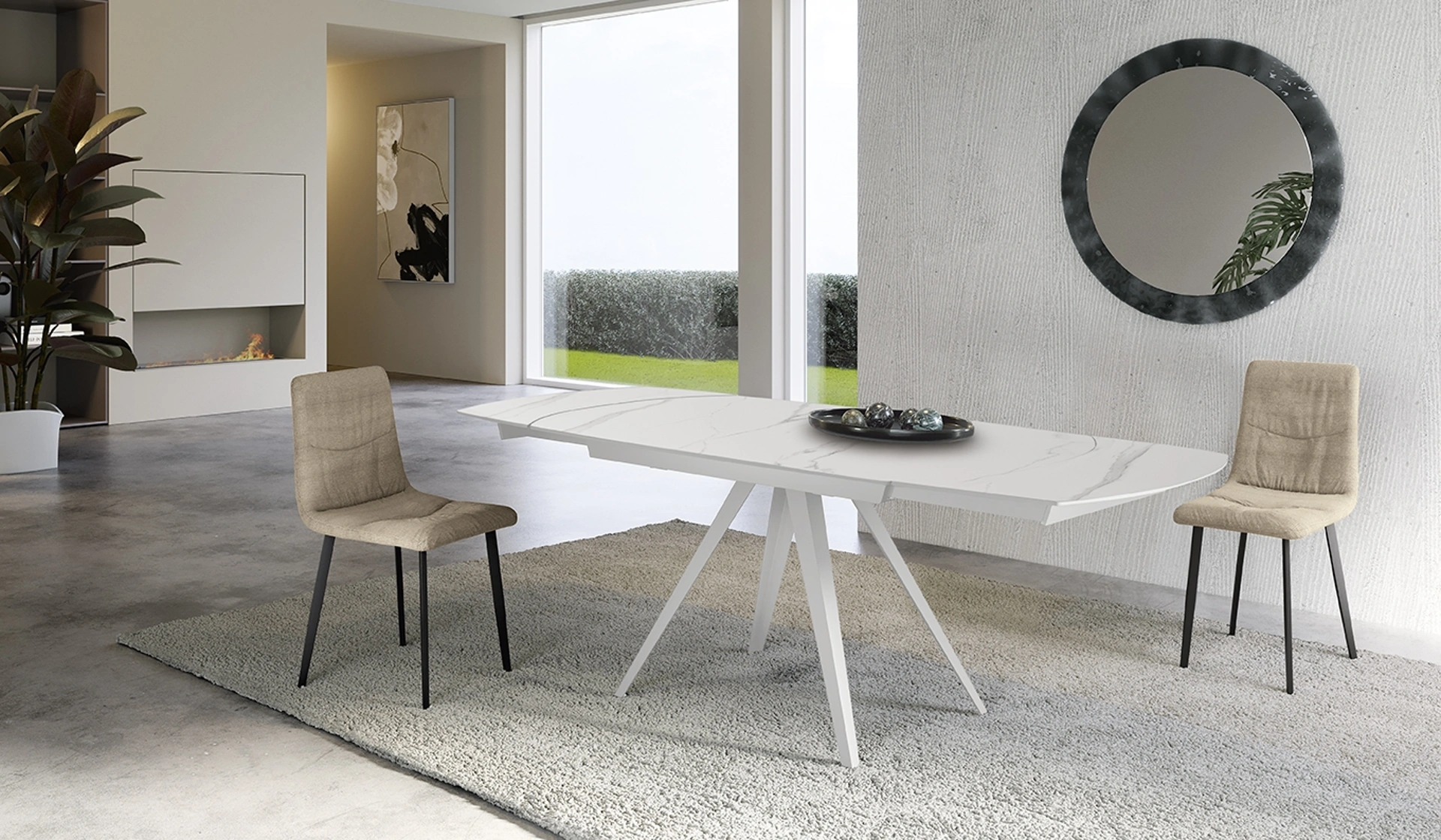 | Materiali: | Top in ceramica (marmo bianco Calacatta, marmo nero Portoro, cemento Grigio Scuro), allunghe interne in ceramica, gambe/struttura in metallo verniciato. |