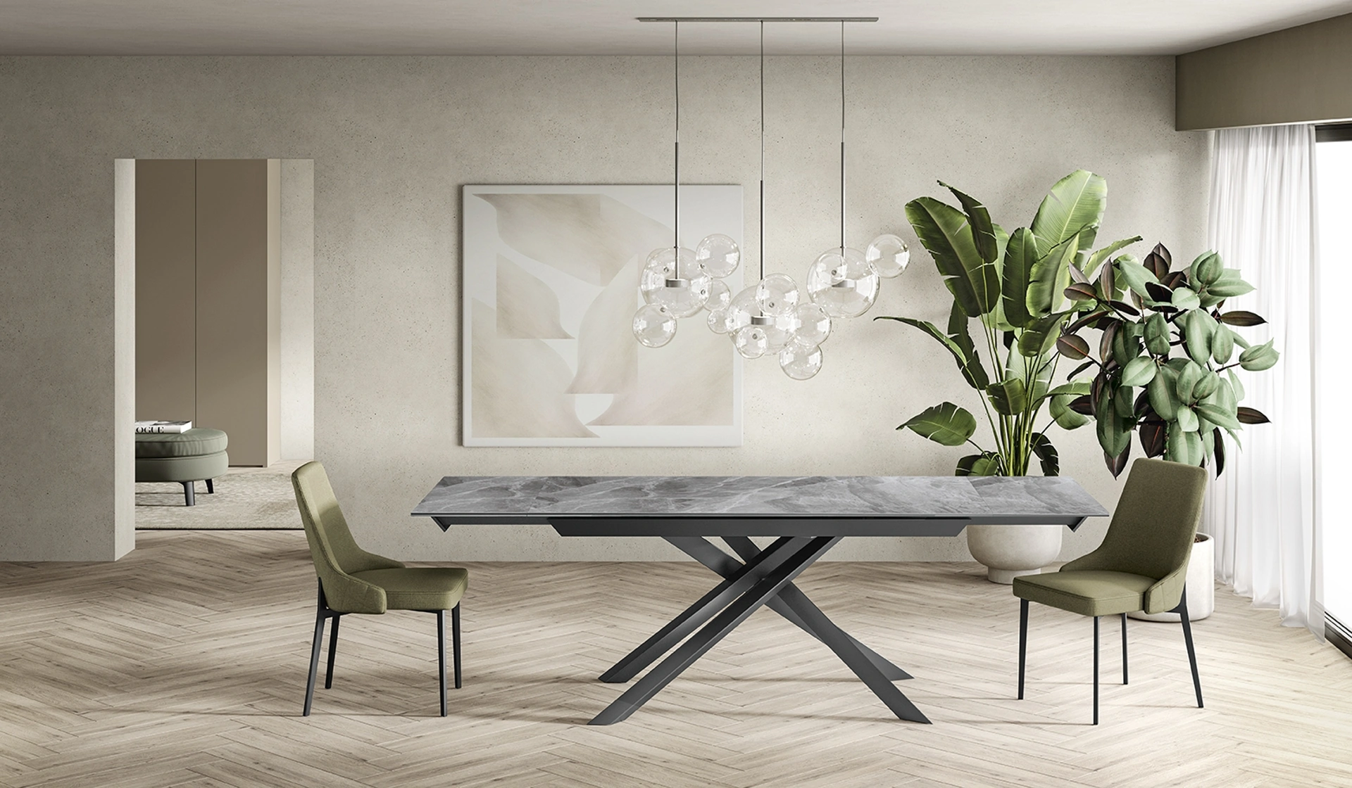 Il tavolo allungabile Tavolo Allungabile Cross, firmato Stones, rappresenta una soluzione d'arredo che coniuga estetica contemporanea e praticità avanzata. La sua struttura si distingue per un piano superiore realizzato in ceramica da 6 mm, stratificato su un vetro temperato da 8 mm con una raffinata finitura lucida, garantendo resistenza e un aspetto elegante. Le robuste gambe in metallo verniciato assicurano stabilità e un supporto solido. Un sistema di allunghe interne, anch'esse in ceramica su vetro, consente un'espansione fluida del piano, passando da 160 cm a 240 cm per adattarsi a diverse esigenze conviviali. Alcune configurazioni offrono gambe dal design intrecciato, che conferiscono un carattere scultoreo unico e distintivo. Il modello è personalizzabile con una varietà di finiture per il top, inclusi effetti come il marmo Portoro opaco, e per le gambe, disponibili in tonalità come il nero o il bronzo, offrendo ampie possibilità di integrazione in ogni ambiente. La selezione accurata dei materiali e la precisione costruttiva garantiscono un prodotto destinato a mantenere inalterate nel tempo le sue qualità estetiche e funzionali.